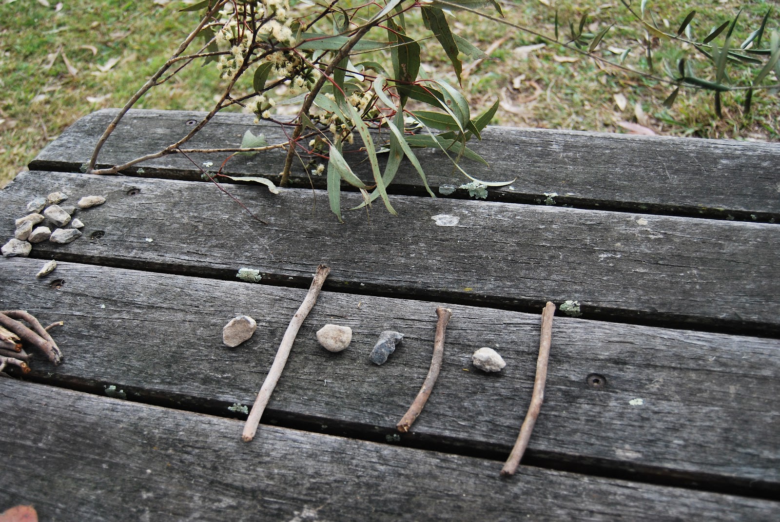First make groups of your found objects. Today we collected sticks, stones and leaves for our game.